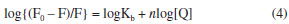 ![]() Figura 5. Gráficos de log{(F0-F)/F} versus log[RuCl2(L)] em diferentes temperaturas