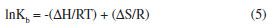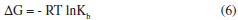 Em ambos os sistemas, o número de sítio ligante é aproximadamente 1, evidenciando, assim, que apenas uma molécula do complexo de rutênio está inserida nos arcabouços proteicos. Contudo, apesar da semelhança estrutural das albuminas bovina e humana, podemos observar comportamento divergente quanto à capacidade de retenção do complexo no interior da biomolécula. Para o sistema BSA - [RuCl2(L)], verificamos a diminuição da constante de associação (Kb) em função do aumento da temperatura {10,1 × 104 mol-1 L (25 ºC), 6,69 × 104 mol-1 L (30 ºC) e 0,67 × 104 mol-1 L (35 ºC)}, o que revela uma redução da estabilidade do derivado formado entre a albumina bovina e o complexo de rutênio e, por conseguinte, abrevia o tempo de retenção do mesmo no interior da biomolécula. Para o sistema HSA - [RuCl2(L)], observamos tendência oposta, ou seja, o aumento da constante de associação com a elevação da temperatura do meio reacional {3,37 × 103 mol-1 L (25 ºC), 5,61 × 103 mol-1 L (30 ºC) e 7,14 × 103 mol-1 L (35 ºC)}, que sugere um aumento da estabilidade do intermediário formado e, consequentemente, aumenta o tempo de retenção do derivado metálico no interior da proteína humana.25 Essa diferença na tendência da constante de associação é consequência da localização do complexo nos sítios de ligação da BSA e HSA. Na BSA, o complexo está interagindo em uma região mais externa (subdomínio IB) e, portanto, mais suscetível à reestruturação do solvente na interface proteína - solução promovida pela variação da temperatura. Já na HSA o complexo de rutênio está inserido em uma cavidade mais interna (subdomínio IIA) e estabilizado por interações hidrofóbicas.25,27 Determinação de parâmetros termodinâmicos O estudo de fluorescência em diferentes temperaturas permite calcular os parâmetros termodinâmicos envolvidos na interação do complexo de rutênio com as biomoléculas BSA e HSA. De acordo com Ross e Subramanian,34 além de descrever a espontaneidade do processo a partir dos termos termodinâmicos, é possível inferir a natureza das ligações que determinam a inserção do complexo de rutênio no arcabouço proteico. Os valores da variação da entalpia (ΔH) e da variação da entropia (ΔS) envolvidos na ligação entre as proteínas e o complexo de rutênio foram calculados utilizando a Equação de Van't Hoff,34 ![]() e a variação da energia livre de Gibbs (ΔG) foi calculada utilizando a equação: ![]() em ambas as equações, Kb é a constante de associação, R = 8,314 J mol-1 K-1 e T é a temperatura em Kelvin. Os valores dos parâmetros termodinâmicos obtidos estão apresentados na Tabela 1. Segundo a literatura, esses dados termodinâmicos indicam que a interação do complexo de rutênio com as albuminas é espontânea e que a sua inserção no arcabouço proteico é determinada por interações hidrofóbicas.