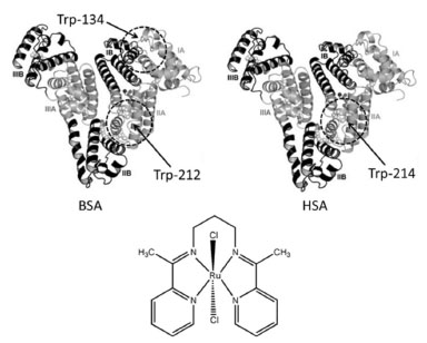 ![]() Figura 1. Representação dos arcabouços proteicos das albuminas do soro bovino (BSA) e humano (HSA), destacando a localização dos resíduos de triptofano, e do complexo de rutênio [RuCl2(L)]