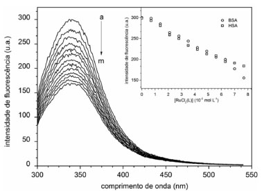 ![]() Figura 2. Espectros de supressão de fluorescência da HSA na presença de [RuCl2(L)], em solução tampão Tris-HCl pH = 7,4; λexc. = 280 nm. Os espectros foram obtidos a partir da titulação de 3 mL de solução HSA 1,4 x 10-5 mol L-1 com adições de 30 a 230 µL da solução estoque do complexo [RuCl2(L)] 1,0 x 10-3 mol L-1, perfazendo as concentrações de 1,0 x 10-5 a 7,7 x 10-5 mol L-1 em complexo (a → m = 0 a 7,7 x 10-5 mol L-1). Na parte superior da figura está representado o gráfico comparativo da supressão de fluorescência da BSA e HSA pelo complexo de rutênio