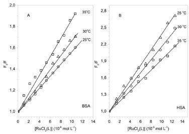 Mecanismo de supressão de fluorescência Como a interação do complexo de rutênio com as albuminas resultou na supressão da fluorescência intrínseca das biomoléculas, fez-se necessário determinar por qual mecanismo esse processo aconteceu: mecanismo estático ou mecanismo dinâmico. Como mencionado anteriormente, no mecanismo estático ocorre a formação de um complexo não fluorescente entre a proteína e o derivado metálico no estado fundamental.36 A estabilidade deste complexo intermediário é diminuída com o aumento da temperatura e, consequentemente, os valores de constantes de supressão (Ksv) diminuem com a elevação da temperatura.36 No mecanismo dinâmico, a interação do complexo de rutênio com a biomolécula ocorre durante o tempo de vida do estado excitado da biomolécula. Após a colisão do derivado metálico com a albumina excitada, a biomolécula retorna ao estado fundamental sem a emissão de fluorescência. O aumento da temperatura promove a diminuição da viscosidade do meio reacional favorecendo a difusão do supressor em direção ao fluoróforo no estado excitado.36 Dessa forma, para o mecanismo dinâmico, o aumento da temperatura induz a um aumento das colisões entre o complexo de rutênio e a BSA (ou HSA) excitada e, como consequência, observa-se um aumento da constante de supressão (Ksv) com a elevação da temperatura.36 Portanto, é possível inferir o mecanismo de atuação do complexo de rutênio no ambiente proteico pela análise da dependência da constante de supressão em função da temperatura. Assim, assumimos o tratamento matemático para a supressão de fluorescência, baseado na equação de Stern-Volmer (eq. 1). Os gráficos de F0/F em função da concentração do complexo para ambas albuminas, ilustrado na Figura 3, apresentaram perfis lineares e, a partir de regressões lineares, foram obtidos os valores de Ksv para os sistemas BSA/HSA - [RuCl2(L)] em diferentes temperaturas.