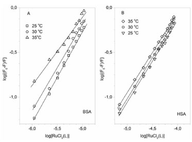 ![]() Figura 3. Gráficos de Stern-Volmer da interação de BSA (ou HSA) com complexo de rutênio, em solução tampão Tris-HCl pH = 7,4, em diferentes temperaturas, λexc. = 280 nm