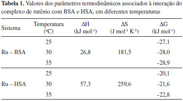 A ligação do complexo de rutênio nas biomoléculas altera parcialmente as estruturas das proteínas e expõe fragmentos apolares do interior proteico para o solvente. Essa pequena mudança conformacional induz a reorganização das moléculas de solvente ao redor da proteína maximizando o efeito hidrofóbico, que é a tendência de espécies apolares a se agregarem em água com reconstrução da estrutura original do solvente.59-61 Dessa forma, o fator hidrofóbico passa a ser determinante na estabilização do sistema proteína - complexo de rutênio. Os parâmetros termodinâmicos também refletem as diferentes localizações do complexo nos sítios de ligação da BSA e HSA.