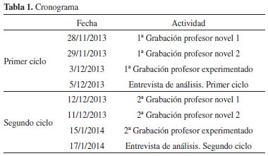 METODOLOGÍA Participantes y localización de la experiencia Los participantes en este estudio fueron dos profesores noveles, uno del Departamento de Química Analítica, con experiencia docente de tres cursos académicos, y otro del Departamento de Ingeniería Química, en su primer año con dedicación docente como becaria predoctoral y una profesora experta, del área de Química Física. La experiencia se lleva a cabo a lo largo del primer semestre del curso 2013/2014. En el caso de la profesora experta y uno de los noveles, las grabaciones se realizaron en clases teóricas de las asignaturas de "Química Física" (del Grado de Química) y "Análisis por cromatografía y técnicas afines" (de la Licenciatura de Química), respectivamente. Para el otro profesor novel, los vídeos se realizaron en clases prácticas de la asignatura "Experimentación en Ingeniería Química I" (del Grado en Ingeniería Química). Cronograma La Tabla 1 recoge el cronograma exacto de la experiencia. Al fijar las fechas de las grabaciones y entrevistas de análisis, se tomó la precaución de dejar un intervalo de tiempo suficiente como para que cada profesor implicado tuviera tiempo de realizar el análisis y valoración del material recogido en la etapa de grabaciones. Así mismo, entre ambos ciclos de supervisión, también se dejó un tiempo prudencial, para que los profesores revisaran los aspectos a mejorar acordados en la primera reunión.