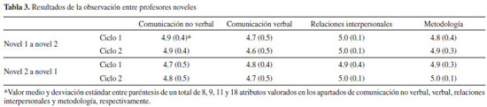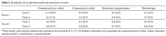 RESULTADOS Y DISCUSIÓN Destacar que aunque la profesora experimentada había participado en más experiencias de grabación, ninguno de los profesores noveles había sido grabado dando clase, por ello mismo, estos dos últimos mostraron en principio pudor a ser grabados, el cual rápidamente desapareció, hasta el punto de terminar valorando muy positivamente la experiencia. Las grabaciones juegan un papel muy importante a la hora de confirmar las creencias que los profesores tienen sobre sí mismos, es decir su autoconcepto profesional.8 Así, por ejemplo, no es raro el impacto que supuso a los profesores noveles su propio tono de voz al escucharse a sí mismos por primera vez dando clases. No obstante, tanto los profesores noveles, como la profesora experimentada, valoran muy positivamente la oportunidad de poder enfrentarse a su propia imagen dando clase. Los tres profesores participantes coincidieron en el hecho de que las percepciones que se tienen al dar la clase son muy distintas vistas desde fuera. Como se ha especificado en el apartado de metodología, el test de observación empleado dispone de apartados en los que otorgar una puntuación numérica del 1 al 5 para los atributos valorados, organizados por bloques, así como, los correspondientes apartados para hacer las observaciones a cada uno de dichos atributos, y una parte final de corolario. En base a esto, organizamos la discusión de los resultados guiándonos por esa misma estructura; en primer lugar, nos detendremos en los resultados numéricos y a continuación, puntualizaremos las ideas y conclusiones más importantes de las entrevistas de análisis. Refiriéndonos a las puntuaciones numéricas reflejadas en los test de observación, apuntar que las puntuaciones no fueron nunca inferiores al 3, sobre un máximo de 5. En este sentido, es interesante destacar la buena concordancia entre las puntuaciones numéricas otorgadas por los tres profesores. Atendiendo a los resultados numéricos, merece la pena pararse en las valoraciones de autoobservación de los noveles, en comparación con sus valoraciones recíprocas. Al fijarnos en el valor medio de todo el conjunto de valoraciones de autoobservación y observación recíproca, se observa cómo las primeras se sitúan por debajo de las segundas. En concreto, la media de las puntuaciones en la autoobservación son 4.3 y 4.6 para los profesores noveles 1 y 2, respectivamente, mientras que los valores correspondientes a observación recíproca entre noveles son 4.8 en ambos casos. Se observa igualmente un aumento en los valores medios del análisis para el segundo ciclo, tanto en autoobservación como observación recíproca, manteniéndose de nuevo la tendencia a la baja de los valores de la autoobservación. La media de las valoraciones de autoobservación son en el segundo ciclo de 4.5 y 4.7 para noveles 1 y 2, respectivamente y 4.8 y 4.9 en las observaciones de 1 a 2 y 2 a 1, respectivamente. Lo que inmediatamente se infiere de estos resultados es, en primer lugar, que los profesores noveles son más severos en su valoración propia que en la valoración de otro semejante y, en segundo lugar, que se demuestra la eficacia de la estrategia del doble ciclo de mejora, lo cual se refleja en el aumento de la valoración numérica. Las medias y desviaciones estándar de las puntuaciones por bloques de aspectos, tanto para la autoobservación como para la observación entre profesores noveles, se resumen en las Tablas 2 y 3, respectivamente. En la tabla de autoobservación se aprecia cómo en el bloque de metodología recaen puntuaciones ligeramente superiores. En el caso de las autoobservaciones (Tabla 2), se produce un aumento de las medias del primer al segundo ciclo en todos los bloques de atributos valorados, lo que demuestra la efectividad del doble ciclo de mejora en el autoconcepto profesional de profesores noveles, a nivel de comunicación verbal y no verbal, relaciones interpersonales y metodología. Este aumento del primer al segundo ciclo no es tan notable en el caso de la observación recíproca entre noveles (Tabla 3), debido a que las valoraciones en el primer ciclo, en este caso, ya son bastante elevadas.