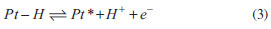 RESULTADOS Reação de adsorção-dessorção de hidrogênio em platina A reação de adsorção-dessorção de hidrogênio em metais do grupo da platina foi extensivamente estudada nos últimos 60 anos e serve hoje como ferramenta na interpretação de resultados obtidos em estudos fundamentais e aplicados em química de superfície, eletrocatálise, entre outras.10 Especificamente, tanto o uso da LSV quanto da SCV, no estudo do processo de adsorção de hidrogênio em platina, são baseados no fato de que uma alteração do potencial em um determinado intervalo provoca uma alteração no recobrimento de átomos de hidrogênio sobre a superfície de platina. O processo de adsorção-dessorção ocorre por meio da reação de transferência de carga. Assim, para um dado potencial, certo grau de cobrimento sobre a superfície com os átomos de hidrogênio é estabelecido e mantido pela descarga rápida de íons hidrogênio, de acordo com a reação (Eq. 3): ![]() No entanto, além da concentração do reagente em solução, a velocidade da reação depende também da concentração superficial dos reagentes, ou seja, a cinética eletródica está relacionada aos sítios livres superficiais e à cobertura das espécies eletroativas.11 A reação de adsorção-dessorção de hidrogênio sobre platina em meio ácido está entre as mais rápidas reações eletroquímicas conhecidas12 e o fato de usarmos métodos transientes para estudo de processos eletródicos (neste caso, LSV e SCV) deve ser encarado com cuidado redobrado. Os voltamogramas cíclicos obtidos por SCV de Pt em 0,1 mol L-1 H2SO4 a 100 mV s-1, usando a combinação dos diferentes parâmetros apresentados na Tabela 1, estão mostrados na Figura 3. Observa-se que o parâmetro alfa se mostra um fator extremamente influente na resposta de corrente quando comparado ao perfil voltamétrico obtido a partir da aplicação de um sinal analógico (LSV). A influência mais acentuada apresenta-se na região de adsorção de hidrogênio (0,06 V < E < 0,4V), com reflexos também no intervalo de potenciais de formação de óxidos superficiais (PtOH e/ou PtOx - E > 0,8 V). Para valor de alfa unitário, a altura do degrau na composição do sinal SCV exibe boa correlação à resposta obtida pela aplicação de um sinal analógico (LSV). À medida que o período de aquisição da corrente em cada degrau diminui (menores valores de alfa), a resposta à perturbação do sinal escalonado exibe reflexos consideráveis na intensidade de corrente. Este comportamento se deve ao fato que, para baixos valores de alfa, a aquisição da corrente se dá apenas ao final do degrau e, uma vez que o comportamento transiente da corrente ao longo do degrau não se é constante, apenas uma fração do sinal é adquirido.
