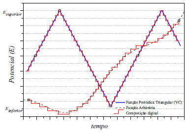 IUniversidade Federal do ABC, Centro de Ciências Naturais e Humanas, Av. dos Estados, 5001, 09210-580 Santo André - SP, Brasil Recebido em 26/08/2014 *e-mail: camilo.angelucci@ufabc.edu.br Cyclic voltammetry has become one of the most useful tools in modern electrochemistry, but the use of digital potentiostats should be treated with caution by users. Staircase Voltammetry utilizes some parameters to build up the potential ramp. However, for some electrochemical processes, the signal response can be different compared with that acquired using true linear sweep (analogic signal). In this work, the role of SCV parameters in current response during the hydrogen electrochemical adsorption/desorption reaction on a platinum surface was studied. In addition, the transient current in each step comprising the ramp was investigated. The results showed that with a step height of 2 mV, the SCV response matches that recorded by linear sweep voltammetry. From the transient current study, two kinds of capacity were identified: non-faradaic and faradaic charge. INTRODUÇÃO Com a popularização de softwares e equipamentos digitais para uso científico, é cada vez mais comum que seus usuários se abstenham de compreender os algoritmos ou parâmetros utilizados para o tratamento ou aquisição dos dados. Esse comportamento é mais que natural, pois os criadores, de uma forma geral, propõem um produto que seja economicamente acessível e que se adeque às necessidades mais corriqueiras dos seus usuários, proporcionando maior rapidez, eficiência e, consequentemente, produtividade. Por outro lado, com a crescente dependência do uso de softwares e equipamentos para solução/execução de problemas, muitos dos usuários, seja por comodidade ou mesmo desconhecimento, utilizam-se dessas ferramentas sem se questionar se tal produto se adequa à sua necessidade e se seu uso poderia gerar resultados equivocados. Mais especificamente, a Eletroquímica obteve um crescimento expressivo nas últimas três décadas como consequência de uma combinação de instrumentação eletrônica moderna e o desenvolvimento de novas teorias. Esse crescimento ocorreu em grande parte devido à popularização do potenciostato, equipamento capaz de medir (estudar) eventos que ocorram em um eletrodo apenas: o eletrodo de trabalho. O fato é que, nos potenciostatos mais modernos, o uso de circuitos analógicos para geração de sinais está cada vez mais ausente, sendo suprido por circuitos digitais que são controlados por softwares. O ganho operacional pelo uso desses softwares para gerar protocolos experimentais diversos é imenso, sendo, neste caso, a qualidade e variedade de protocolos dependentes apenas da empresa ou programador que escreveu o programa. De modo geral, a maioria das técnicas eletroquímicas se baseia em análises da resposta do sistema ante a aplicação de uma perturbação sobre este. Tal perturbação pode ser saltos de potencial, ou uma função que gere um potencial variável com o tempo, como uma rampa linear, pulso, senoidal ou qualquer função arbitrária. As denominações dadas a esses sinais, ou a combinação deles, revelam a natureza do sinal (por exemplo: varredura linear, voltametria de onda quadrada, voltametria de pulso diferencial, voltametria cíclica, etc.). A variedade de combinações é infinita e sua utilização depende do problema a ser abordado. A aplicação desses sinais pode ser gerada a partir de duas fontes distintas: analógica ou digital.1 Brevemente, a analógica se caracteriza por um sinal contínuo no tempo podendo assumir "infinitos" valores em um determinado intervalo; é a que apresenta melhores resultados quanto à composição do sinal e, portanto, a que gera menores dificuldades de tratamento posterior. O sinal digital, por sua vez, se distingue do analógico por ser formado por uma sequência de valores discretos (descontínuos) no tempo, ou melhor, o sinal resultante é uma aproximação escalonada da forma do sinal que se deseja gerar, consequentemente oferecem maior facilidade de processamento, conversão de formatos e minimização de geração de ruídos. Um exemplo bastante ilustrativo está mostrado na Figura 1. Vale destacar que ambos os sinais têm sua importância e validade, no entanto, é necessário conhecer e avaliar o processo eletroquímico que será estudado, uma vez que o efeito do formato do sinal gerado, bem como a aquisição da resposta, pode levar a resultados distintos.