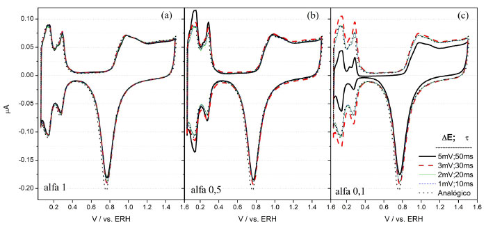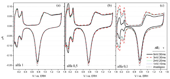 A partir da Figura 2 fica claro que velocidade de varredura (υ) fica definida pela equação 1: ![]() Como resposta à aplicação do sinal escalonado (perturbação), a corrente é registrada para cada degrau e, assim, compõe os dados que formam o voltamograma cíclico. No entanto, na SCV, tecnicamente a corrente pode ser adquirida em diferentes períodos ao longo do degrau (τ) no qual se mantém um potencial constante. Usualmente a corrente é registrada durante um intervalo, aqui definido como parâmetro de amostragem (α), após um período de estabilização (τ'). O parâmetro de: ![]() Sendo τ' o tempo entre a aplicação do pulso e o início da aquisição da corrente e τ o tempo total do degrau. O parâmetro de amostragem (α) pode ser interpretado como a fração da largura do degrau em que a corrente será registrada. O parâmetro α pode assumir valores de 0 a 1, ou seja, para valores próximos à unidade, o conjunto de dados começa a ser registrado logo após o início do degrau, ao passo que um valor de α próximo de 0 indica que os dados são amostrados ao fim de cada degrau. Os efeitos de α, ΔE e τ na resposta eletroquímica são extremamente importantes e devem ser levados em consideração antes de usar o método para estudos fundamentais de processos eletródicos. Contudo, sem a escolha adequada dos parâmetros citados, não há porque esperar a existência de uma equivalência exata entre SCV e LSV, a não ser no limite quando ΔE tende a zero. Alguns estudos mostraram que, para processos controlados por difusão, a diferença entre SCV e LSV se torna menor à medida que a altura do degrau (ΔE) diminui; para valores de ΔE< 0,23 mV os resultados obtidos pelas duas técnicas são idênticos.7 No entanto, para processos que envolvem reagentes e/ou produtos adsorvidos, cristalização ou polimerização na superfície eletródica, as diferenças entre LSV e SCV se mostram ainda mais discrepantes, mesmo para pequenos valores de ΔE.8 A fim de avaliarmos a extensão da influência dos parâmetros presentes na SCV e sua utilização em experimentos eletroquímicos, apresentamos a seguir exemplos experimentais do comportamento voltamétrico de algumas reações eletródicas sobre Pt policristalina em meio ácido, obtidos por LSV e SCV.
