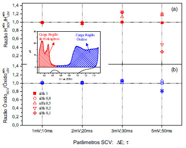 A influência de cada parâmetro na SCV pode ser melhor analisada a partir da comparação com o perfil voltamétrico obtido pela LSV. A Figura 4 mostra a razão entre as cargas obtidas pela integração das curvas voltamétricas realizadas por SCV e LSV. Na região de adsorção de hidrogênio os dados indicam que a escolha dos parâmetros da SCV podem gerar diferenças de carga de até 70%. Para potenciais superiores a 0,7 V, região de adsorção de água e formação de espécies oxigenadas, a influência desses parâmetros se mostra menos importante.