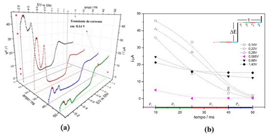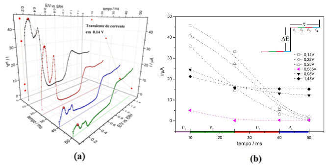 Figura 6. (a) Varredura positiva dos VC's de Pt em 0,1 M H2SO4 obtidos pela aquisição das correntes adquiridas em diferentes períodos em cada degrau que compõe o sinal da SCV. (b) Transiente de corrente obtidos pelos valores extraídos ao longo de cada degrau em diferentes potenciais do sinal de SCV. Parâmetros utilizados no experimento de SCV: υ = 100 mV s-1. ΔE = 5 mV, τ = 50 ms