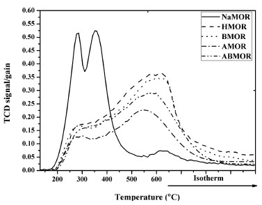 ![]() Figure 2. NH3-TPD profiles of (a) NaMOR, (b) HMOR, (c) BMOR, (d) AMOR, and (e) ABMOR