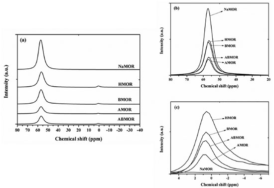 RESULTS AND DISCUSSION Characterization by XRD, nitrogen adsorption-desorption and ICP XRD patterns of all samples (Figure 1S in Supplementary Materials) showed characteristic peaks of zeolite MOR.10,11,14 The modification did not destroy the zeolite structure. The nitrogen adsorption-desorption isotherm of the NaMOR, HMOR, BMOR, AMOR, and ABMOR are shown in Figure 2S in Supplementary Materials. Their BET surface areas were 414, 531, 545, 612 and 632 m2/g, respectively. The modified samples had higher surface area. The formation of large pores were suggested by the hysteresis loop which was caused when the adsorption and desorption lines were not superimposed. Their Si/Al ratios determined from ICP were 11.0, 10.5, 9.5, 35.5 and 27.8 respectively. The decrease and increase of Si/Al ratio indicated desilication and dealumination, respectively. Both changes caused formation of pores larger than the micropores of the zeolite. In AMOR, the acid treatment could open the side pocket of HMOR resulted in an increase of micropore surface area.3,5 The sample with the most open structure was ABMOR which had the highest surface area and adsorption isotherm type IV with narrow slit-like mesopores.15 Characterization by 27Al MAS NMR 27Al MAS NMR profiles of the parent NaMOR and modified MOR are shown in Figure 1(a). Comparisons of intensities of the position at 56 and 1 ppm are provided in Figure 1 (b) and (c), respectively. The parent NaMOR showed only one peak at 56 ppm which is a characteristic of framework tetrahedral coordinated AlO4 (AlF-td) in the zeolite.16 In HMOR and modified MOR, the intensity of AlF-td decreased in the following order: NaMOR > HMOR > BMOR > ABMOR > AMOR. The peak at 1 ppm, characteristic of extraframework octahedral coordinated AlO6 (AlEF-oh) was also observed. The intensity was also in the same order, namely, HMOR > BMOR > ABMOR > AMOR.