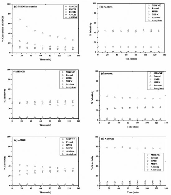 Figure 3. (a) MBOH conversion on MOR zeolites, (b) - (f) product selectivity on NaMOR, HMOR, BMOR, AMOR, and ABMOR