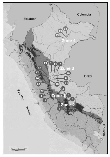 ![]() Figure 1. Collection sites of U. tomentosa wild samples in Peru: zone 1 (Junín and Pasco), zone 2 (Junín), zone 3 (Ucayali) and zone 4 (Loreto). For more details see Table 1S (Supplementary material)