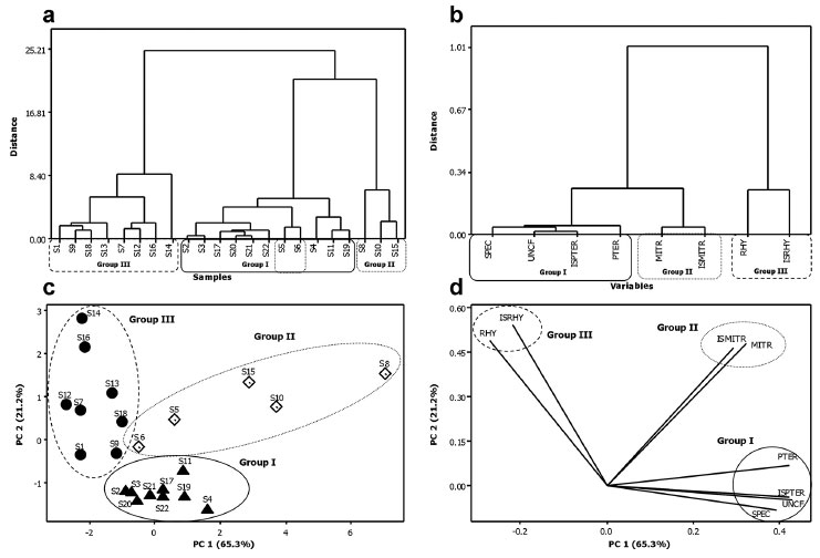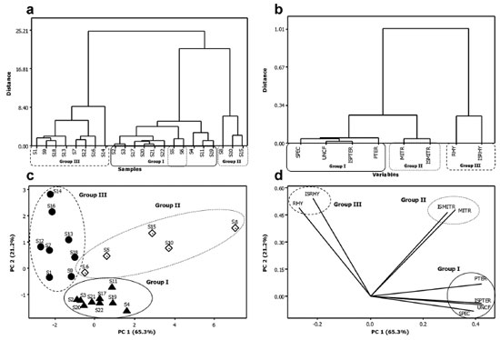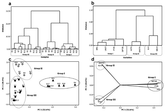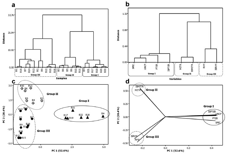 Figure 2. HCA and PCA analyses of U. tomentosa stem bark samples considering only the oxindole alkaloids: (a) dendrogram of the samples using Ward's as linkage method and the Euclidean distance, (b) dendrogram of the variables using the single linkage method and correlation coefficient distance, (c) score and (d) loading plots (PC1 versus PC2) from the chemical data. Group I - predominance of POA with cis D/E ring junction, namely, speciophylline (SPEC), uncarine F (UNCF), pteropodine (PTER) and isopteropodine (ISPTER); Group II - predominance of POA with trans D/E ring junction, namely, mitraphylline (MITR) and isomitraphylline (ISMITR); Group III - predominance of TOA, namely, rhyncophylline (RHY) and isorhyncophylline (ISRHY)