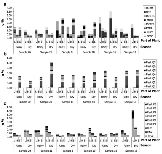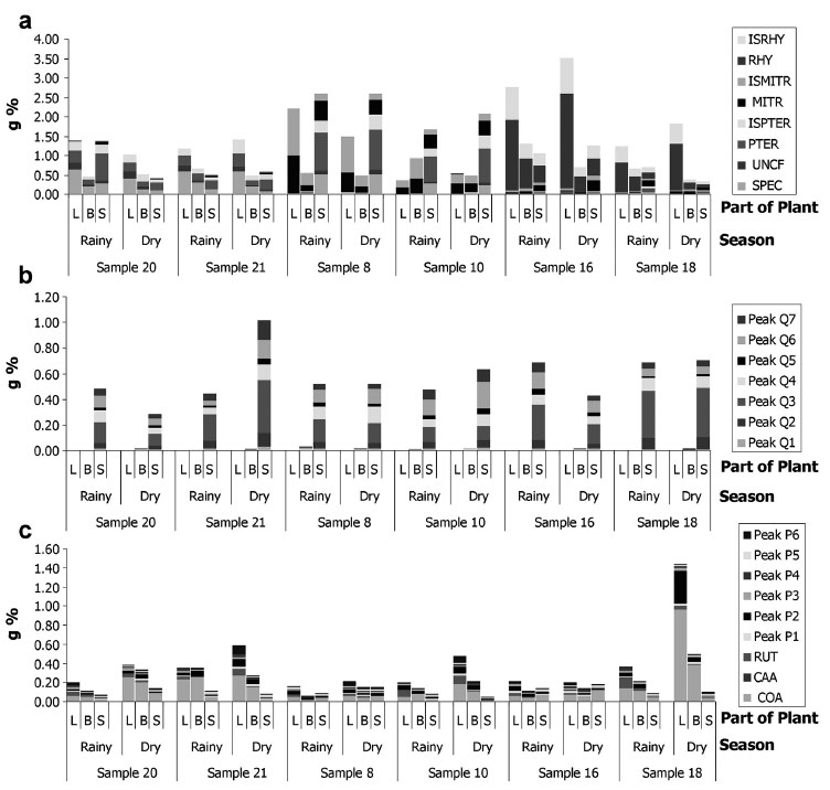 Influence of the season on the chemical composition of stem bark, branches and leaves Cat's claw samples from group I (20 and 21), group II (8 and 10), and group III (16 and 18) comprising stem bark, branches and leaves were selected owing the alkaloid profile similarity among them. The samples were evaluated in the rainy season (February) and dry season (November) (Figure 5). The chemical profile of samples remained basically unchanged, although quantitative variations could be verified. Samples collected during the dry season showed higher PPH content than in the rainy season, especially for chlorogenic acid (Figure 5c). On the other hand, no accumulation in either the dry season or rainy season was found neither for oxindole alkaloids (POA and TOA) (Figure 5a) nor QAG (Figure 5b).