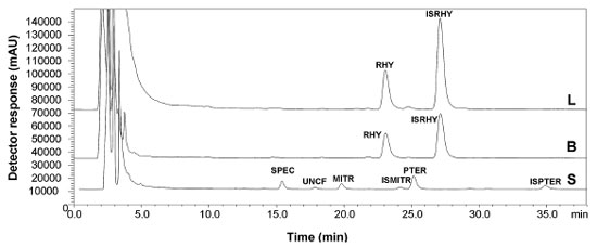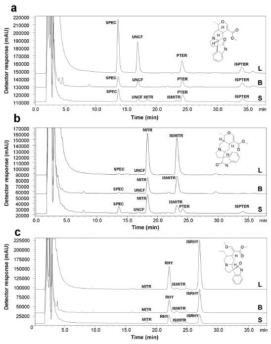 ![]() Figure 6. HPLC-PDA chromatograms of oxindole alkaloids in (S) stem bark, (B) branches and (L) leaves from U. tomentosa wild samples: (a) sample 22 (group I - predominance of POA with cis D/E ring junction, namely, speciophylline (SPEC), uncarine F (UNCF), pteropodine (PTER) and isopteropodine (ISPTER)), (b) sample 6 (group II - predominance of POA with trans D/E ring junction, namely, mitraphylline (MITR) and isomitraphylline (ISMITR)) and (c) sample 12 (group III - predominance of TOA, namely, rhyncophylline (RHY) and isorhyncophylline (ISRHY)). Detection at 245nm