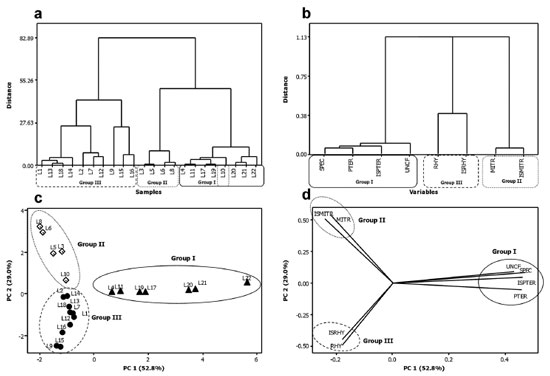 Figure 4. HCA and PCA analyses of U. tomentosa leaves samples considering only the oxindole alkaloids: (a) dendrogram of the samples using Ward's as linkage method and the Euclidean distance, (b) dendrogram of the variables using the single linkage method and correlation coefficient distance, (c) score and (d) loading plots (PC1 versus PC2) from the chemical data. Group I - predominance of POA with cis D/E ring junction, namely, speciophylline (SPEC), uncarine F (UNCF), pteropodine (PTER) and isopteropodine (ISPTER); Group II - predominance of POA with trans D/E ring junction, namely, mitraphylline (MITR) and isomitraphylline (ISMITR); Group III - predominance of TOA, namely, rhyncophylline (RHY) and isorhyncophylline (ISRHY)