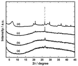![]() Figure 2. XRD diffractograms of (a) PAMACRYL/NONT5, (b) PAMACRYL/NONT10, (c) PAMACRYL/NONT20, and (d) NONT