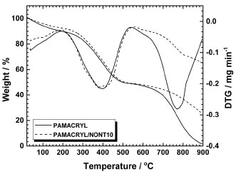 ![]() Figure 3. TGA and DTG curves of PAMACRYL and PAMACRYL/NONT10