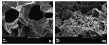 The PAMACRYL and PAMACRYL/NONT10 TGA curves show clearly three stages for the weight losses. The first stage (50 - 200 ºC) can be attributed to the moisture and volatile compounds losses by the samples. Following, in the temperature range of 300 - 450 ºC the weight losses are attributed to the thermal decomposition of the acrylate and amide side groups of the copolymers and also MBA moieties spread in the SH matrix, leading to the evolution of ammonia and other gases for instance. During this period, the onsets in the PAMACRYL and PAMACRYL/NONT10 TGA curves are similar; however is possible to observe a slight increase in thermal stability of the SH composite due to NONT presence. For PAMACRYL, thermal decomposition temperature is 391ºC (33.5%), while for PAMACRYL/NONT10 is 399 ºC (33.3%). The last stage was attributed to the breakage of copolymer chains, in which was observed a displacement for higher temperatures when are NONT is incorporated in the SH matrix. Additionally, the total residue at 900 ºC was c.a. 1.55% for PAMACRYL and c.a. 25.46% for PAMACRYL/NONT10. Figure 3 shows the NONT incorporation on the PAMACRYL matrix has positive effect on its thermal stability. The fracture morphology of the SH and SH composite was examined by SEM as shown in Figure 4. As it is clear from Figure 4a, PAMACRYL shows microporous surface, with large and irregular pores heterogeneously distributed. Such morphology allows SH absorbing high amounts of liquid. On the other hand, it can be seen in Figure 4b the surface morphology of superabsorbent changes due to the NONT incorporation in its formulation. The morphology of the PAMACRYL/NONT10 superabsorbent exhibit rugged, coarsened, and correspondingly loose surfaces. Undulant and coarsened surfaces increase the surface contact area, which makes easy the diffusion of liquid inward the SH matrix. This ensures high water uptake capacity for the final superabsorbent composite. Additionaly, such morphology demonstrates the filler (NONT in this case) is completely incorporated within the copolymer chains and well dispersed in the SH matrix (see Figure 4b). Such scenery is very desirable since the high dispersion of NONT particles in the SH network prevents flocculation of clay particles and enhances the water uptake capacity of the SH composite.
