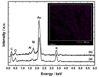 In addition from the SEM images, EDX spectra of the PAMACRYL and PAMACRYL/NONT10 were collected to evaluate their elemental composition. As can be seen in Figure 5, both PAMACRYL and PAMACRYL/NONT10 spectra showed three well-resolved peaks accounting to the elements C, O, and K. On the other hand, the EDX spectrum of PAMACRYL/NONT10 (Figure 5) also shows the characteristic peaks assigned to the elements Si and Al. The appearing of such peaks corroborates with the data obtained by other techniques utilized here. All of them confirm the successfully formation of the SH composite. Further, to confirm the NONT dispersion into the SH matrix, the Si elemental distribution map (EM) was recorded from PAMACRYL/NONT10 sample (Figure 5). As it is clear in the EM figure the characteristic Si element present in the NONT structure can be easily observed through the entire mapped region. The EM confirms either the NONT presence as its high dispersion.