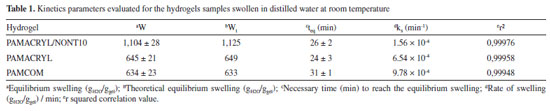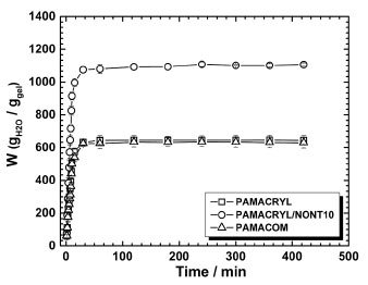 ![]() Figure 7. Swelling kinetics curves for PAMACRYL, PAMACRYL/NONT10, and PAMACOM