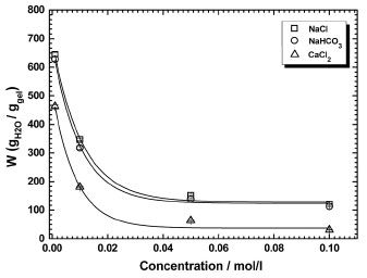![]() Figure 8. Water uptake variation of PAMACRYL/NONT10 in salt solutions with different concentrations