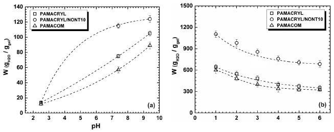 The increase in the ionic strength reduces the difference in the concentration of movable ions between the bulk of polymer matrix and the external solution. Two main factors related to the cation presence can affect the water uptake capacity: (i) Shielding effect of the monovalent cations on the negatively charged groups present in the hydrogel matrix. This factor contributes to the compression or contraction of the three-dimensional structure driven by reduction on the repulsive forces proceeding from the negatively charged groups. Therefore, the osmotic pressure difference between the hydrogel matrix and the external solution decreases, which results in a lower uptake.32 (ii) Physical crosslinking promoted by the presence of multivalent cations (e.g. Ca2+ and Al3+), which increases the matrix rigidity and avoids that considerable amounts of water had been absorbed. Mahdavinia et al. (2004) reports a decreasing in the water uptake of chitosan-graft-PAN hydrogels as function of the cation charge.32 This effect was attributed to the complexation ability of those multivalent cations with negatively charged groups of the copolymer based on chitosan, acrylic acid and acrylamide. Here, salts contained divalent and trivalent cations reduce the swell of PAMACRYL and PAMACRYL/NONT much more than salt contained only monovalent ions. This is due to the complexing ability of the carboxymide or acrylate groups and the formation of inter and intramolecular complexes.33 Differently of the type of cation, the swell of PAMACRYL and PAMACRYL/NONT10 was not influenced by external type of anions, as can be seen in Table 3. The effect of pH on the swelling process of SH and SH composites has huge importance for targeting application of these kinds of materials. Normally, the variation of pH in the environments where the hydrogel is placed causes fluctuations in the free volume accessible for penetrating water molecules, which, then affects the characteristics of swelling of the hydrogel.34 In light of this, a series of swelling assays were carried out, in order to determinate the water uptake capacity for the PAMACRYL, PAMACRYL/NONT10, and PAMACOM in different pH solutions ranged from 2.4 to 9.4. According to the data displayed in Figure 9, is possible to verify all the samples tested are pH sensitive. PAMACRYL, PAMACRYL/NONT10, and PAMACOM, showed an increase in the water uptake with the pH increasing from 2.4 to 9.4. At low pH, the acrylate anions are protonated and the anion-anion repulsive forces no longer exist. This leads to a minimum in the water uptake of the SHs and SH composite. On the other hand, at high pHs those acrylate groups get charge and such charges promote electrostatic repulsion among COO- groups. The repulsive forces weaken the polymeric matrix stability and allow its expansion. As result, a high water amount diffuses inward the SH as can be seen in Figure 9a.34 At pH 9.4 all the SH samples swelled about 10 folds or more than at buffer of pH 2.4 due to the repulsion of the ionized groups. PAMACRYL/NONT10 showed the highest W values for all the pH range as can be seen. At pH low pH conditions the carboxylate groups present in hydrogel matrix are in their protonated form, which reduces the repulsive forces among the negative charges and the water uptake. However, at high pH conditions, those carboxylate groups are in their ionized form. Therefore, the negative charge density within the hydrogel matrix increases as well the repulsive forces that destabilizes and expand the SH and SH composites matrices that absorb considerable water amounts.