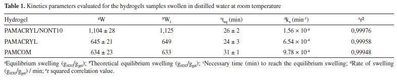 The swelling data displayed in Figure 7 highlight all the samples have high equilibrium swelling ratio, a common characteristic found in superabsorbent hydrogels (SH). The main property of SHs is their capacity of absorbs hundred times its own weight of water. PAMACRYL and PAMACOM samples showed very similar swelling kinetics curves, where the equilibrium swelling is achieved fast in both cases and such equilibrium remains up to the assays end. The W values calculated for PAMACRYL and PAMACOM at the equilibrium were 645 and 634 gH2O/ggel. From Figure 7 is possible to observe PAMACRYL/NONT10 sample presented the highest water uptake capacity. The W value calculated to the PAMACRYL/NONT10 sample at the equilibrium was 1,104 gH2O/ggel, almost two times higher than those calculated for PAMACRYL and PAMACOM. The swelling kinetic curve of PAMACRYL/NONT10 showed a quick increasing during the first 15 min of immersion, reaching about 90% of the equilibrium value up to this immersion time, followed by a slower process until the equilibrium being reached at about 30 min. The mechanism that drives the swelling process of each sample as evaluated using a second-order swelling kinetics model,21 which can be expressed as follows: ![]() where: ![]() and ![]() The A parameter corresponds to an initial swelling rate [(dW/dt)0] of the hydrogel sample, ks is the constant rate for swelling and Wt is a theoretical swelling value at equilibrium. Wt and ks were calculated by fitting experimental data shown in Figure 5 to equations (2), (3), (4) and the results are given in Table 1.