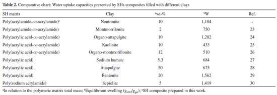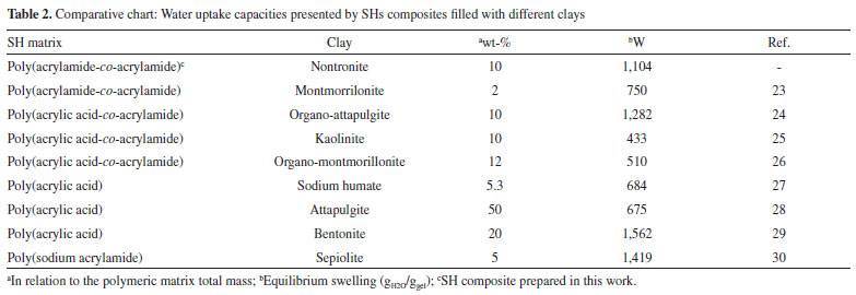 Swelling data presented in Table 1 corroborates with the data displayed in Figure 7 and both confirms the SH composite presents the highest water uptake capacity. This can be explained by two factors: the first one is the formation of intense interactions among -OH groups on the surface of the clay and the water molecules. The disposition of those -OH groups inside the SH matrix increases its hydrophilicity cause a higher water uptake. The second factor can be explained analyzing the XRD pattern of NONT (see Figure 2). When clays are dispersed in the SH matrix on a nanometric scale, as observed in this case, a higher interaction among the clay layers and the copolymer chains occurs and promotes the improvement of the water uptake capacity. Similar results were reported by Santiago et al.22 The high water uptake capacity presented by the SH after the incorporation of NONT is a desirable feature. Such outstanding capacity potentizes the application of our original SH composite in several fields, especially in those were high absorption rate and capacity are necessary (i.e. water reserving in soil and soil conditioning). The water uptake data presented here are very expressive when compared to others SH matrices filled with different clays. Taking into account, Table 2 shows some water uptake data for SHs composites filled with different clays.