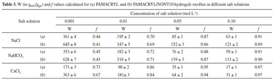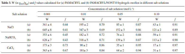 In this work, the effect of some cations and anions on the water uptake capacity of PAMACRYL/NONT10 was evaluated in different concentration (0.001 - 0.1 mol L-1) of NaCl, NaHCO3, and CaCl2 salt solutions. The W values calculated from the swelling assays are shown in Figure 8. As it can be seen, the W values were appreciably reduced as compared to those calculated in deionized water. Additionaly, for all the salt solutions W gradually decreased as the salt concentration is increased. This well-known phenomenon is commonly observed when hydrogels swell in ionic environments, due to a decreased difference in the osmotic pressure (ionic pressure) between the polymer network and the external solution.31 With the increasing of salt concentrations in the solution where the gel is immersed, the difference in osmotic pressure between the gel network and the external solution decreased and, as a result, the water absorbency of PAMACRYL/NONT10 is significantly decreased. Despite this behavior, the W values were very similar of both Cl- and HCO3- ions, which suggest SH composite does not show sensibility to these anions neither to their sizes. An analogous observation was recently reported for a poly(acrylamide-co-acrylate) matrix filled with cellulose nanowhiskers.20