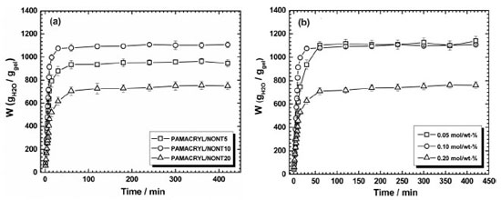 Swelling performance Typically, hydrogels and superabsorbent hydrogels consist of physically or chemically crosslinked hydrophilic polymer chains forming a three-dimensional network. The process of swelling of a hydrogel is driven by chemical and physical forces and by the consequent elastic response of the constituent chains of the matrix. Swelling is primarily due to the penetration of aqueous liquid inward the hydrophilic polymer matrix by capillary and diffusion forces. Thus, liquid is absorbed by hydrophilic groups such as hydroxyl, carboxyl, and amino due to formation of H-bonds.15 The water uptake capacity and the rate of swelling of hydrogel has a direct relation to internal factors, such as the variation of osmotic pressure between the interior of the gel and the external media; the crosslinking density; the affinity between the hydrogel and the liquid; and by external factors (i.e. presence of salts, pH, and temperature, etc.) For hydrogel composites other factor has to be considered; the filler content. Before to compare the swelling performance of the SH composite in relation to the conventional SH some optimization conditions were tested. Besides, two variables for the SH formulations were tested: (i) the effect of NONT content; and (ii) the effect of MBA content (crosslinker agent) on the water uptake capacity. As demonstrated in Figure 6a, the incorporation of 10 wt-% of NONT on the SH formulation leads to a maximum in the water uptake property when compared to the other formulations. According to Wang and Xie,16 cations present in the clay increase the hydrophilicity of the composite and the difference in osmotic pressure between the polymer and the outside solution. On the other hand, the incorporation of 20 wt-% of NONT resulted in a significant reduction in the W profile. This behavior can be attributed to extra crosslinking points in the SH network due to the NONT incorporation. High crosslinking density reduces the matrix elasticity and the water uptake capacity is negatively affected.10,17 Furthermore, the entrapment of NONT in the interconected porous structure, caused by the excessive content of clay particles, decreases the empty space inside the SH matrix, which consequently decreases the content of absorbed water. The SH with 5 wt-% of NONT showed a intermediare water uptake behavior between those other two formulations. According to these data, the SH composite formulated with 10 wt-% of NONT (the sample PAMACRYL/NONT10) was utilized, as reference of SH composite, for all the subsequent swelling assays.
