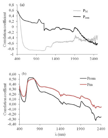 ![]() Figure 1. Correlation coefficients of the concentrations of P Mehlich-1 (PM) and P remaining phosphate (Prem) of the soils with the spectra of their respective solutions (a) and with the soil spectra (b)