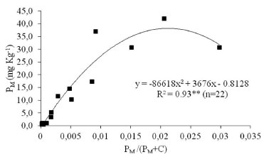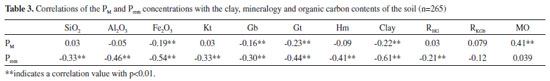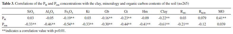 The soil PM concentrations were positively correlated with the concentrations of organic matter in the soils (Table 3). The PM solutions from the 0.05 - 0.10 and 0.80 - 1.00 m layers of the soil profiles contained 0.10 to 0.40 mg mL-1 of carbon (mean 0.25 mg mL1). There was no direct correlation between the organic carbon concentration of the PM solution and the PM concentration of the soil; however, for a given P concentration of the solution: the greater the extraction of C by the double acid solution, the greater the PM concentration determined by colorimetry (Figure 2). The Prem concentration was correlated with the concentrations of clay and oxides, primarily hematite and aluminum oxide (Table 3).