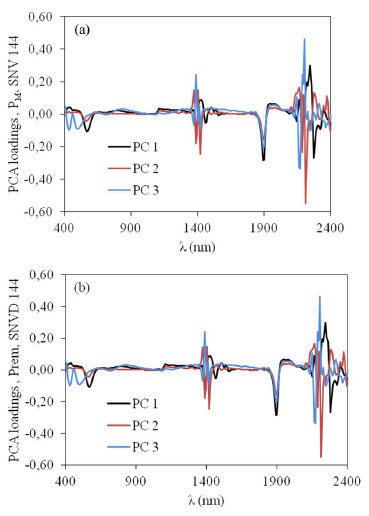 ![]() Figure 3. Loadings of the principal components decoupled from the PLSRm of the SNV 144 model for PM (a) and the SNVD 144 model for Prem (b)