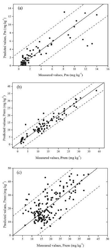 Figure 4a and 4b present the relationships between the measured values and those predicted by the cross validation of the PLSRm. In the cross validation of PM, the residuals of the prediction increase as a function of the increase in the PM concentration in the soil, primarily beginning at 8 mg kg-1, and the model is characterized by an R2v of less than 0.2, regardless of the pre-treatment (Table 4 and Figure 4a). The Prem model (SNVD 144) had an R2c = 0.93; however, it was not suitable for the prediction of the soil Prem concentrations, R2v = 0.48 (Table 4 and Figure 4c).