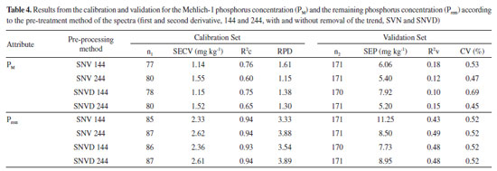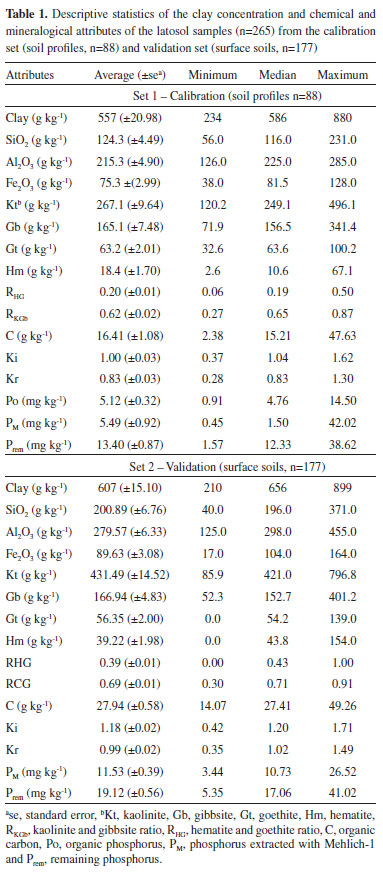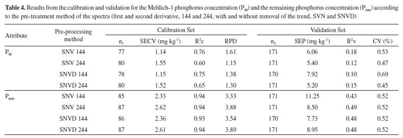 MATERIALS AND METHODS Sampling procedure For the study, a collection of samples from a 700-ha area of Red Yellow Latosols (according to the Brazilian taxonomic system)29 and Red Latosols, located on the Brazilian Central Plateau (municipality of Planaltina - Goiás state) was analyzed. A description of the site is given in Oliveira et al..28 A set of 88 samples was collected in triplicate from 11 soil profiles from the following layers: 0.00 - 0.05, 0.05 - 0.10, 0.125 - 0.175, 0.225 - 0.275, 0.325 - 0.375, 0.725 - 0.775, 0.875 - 0.925, 1.075 - 1.125 m. A second set of 177 samples from the 0.05 - 0.10 m layer was collected from a regular 2-ha grid. Analytical procedure For the general soil characterization, chemical and physical analyses were performed as described in Claessen et al.30 Air-dried samples were sieved through a 2-mm mesh. The particle size analysis of the soil (air-dried fine earth) was done using the pipet method, after slow agitation for 16 hours and chemical dispersion with sodium hydroxide (NaOH, 1 mol L-1). The SiO2, Al2O3 and Fe2O3 concentrations were obtained by extracting the soil samples with a 1:1 H2SO4 solution followed by inductively coupled plasma atomic emission spectroscopy (ICP-AES). The SiO2 and Al2O3 concentrations were used for the calculation of kaolinite (Kt) and gibbsite (Gb) concentrations,31 and the Fe2O3 concentrations were associated with the matrix and color of the soil for the calculations of the hematite (Hm) and goethite (Gt) concentrations,32 assuming 33% and 16% substitution of aluminum in each mineral, respectively.33 The organic carbon concentration was determined by the oxidation method using potassium dichromate (0.4 N). The P concentrations from the Mehlich-1 method (PM) were determined using a double-acid extractant, 0.05 mol L-1 HCl + 0.0125 mol L-1 H2SO4. The remaining P (Prem) was determined in the equilibrium solution after agitation of the soil samples (5 g) with a 0.01 mol L-1 CaCl2 solution containing 60 mg kg-1 P. The P concentrations in the PM and Prem extracts were obtained by molecular absorption spectroscopy at 725 nm after the formation of the molybdenite-P complex via reduction by ascorbic acid (blue color).34 Vis-NIR spectra collection All the spectra were collected using a FOSS NIRSystems XDS spectrometer (Silver Spring, MD, USA), which operates in the Vis-NIR region between the 400 and 2500 nm wavelengths. Soil spectra The soil samples (< 2 mm) were dried in an oven at 40 ºC for 24 hours for standardization and reduction of the effect of moisture. An approximate mass sample of 5 g was scanned in a 50-mm diameter cylindrical cuvette with a quartz window. The spectral data were recorded in the reflectance mode to produce a spectrum with 1050 points and a spectral interval of 2 nm. Each sample spectrum represented an average of 32 readings. The average spectrum from three replicates for each layer of the soil profiles was obtained using the WinISI II v1.50 software (Foss NIRSystems/Tecator Infrasoft International, LLC, Silver Spring, MD, USA). The results, expressed in absorbance (A), were obtained from the logarithm of the inverse of reflectance. Spectra of the solutions The same equipment was used to obtain the spectra of the PM and Prem sample solutions, which were collected using a solution volume of 15 mL in a 5-cm diameter glass cuvette with a height of 10 cm. Each sample spectrum represented an average of 32 readings. The average spectrum from three replicates for each solution was obtained using the WinISI II v1.50 software (Foss NIRSystems/Tecator Infrasoft International, LLC, Silver Spring, MD, USA). Hereafter, the term "solution" will be used to refer to the PM and Prem extraction solutions. The reference standard for the physico-chemical relationship between P and the spectra was a 20 mg kg-1 monopotassium phosphate (KH2PO4) solution. These spectra were collected to observe the relationship between the reference spectra and those obtained for the soil P extraction solutions. For this purpose, the spectra of the solutions extracted from the soil samples from the 0.05 - 0.10 and 0.80 - 1.00 m layers of the profiles were used. Pre-processing of the soil spectra The pre-treatments applied to the spectra of the soil samples followed the recommendations of Brunet et al.35 The derivatives were used to reduce the baseline variation and improve the visualization of the characteristic peaks of the spectra.36,37 The first and second derivatives were calculated using four smoothing points and four points between gaps. This procedure was performed with or without the normalization of variances (SNV or SNVD) for the first and second derivative (144 and 244). The normalization procedure reduces the variation in the slope of a spectrum caused by the scattering effect and by variations in particle size38,39 and it also removes the linear or curvilinear trend from a spectrum.38 Thus, four pre-processing methods were used on the spectra: SNV 144, SNV 244, SNVD 144 and SNVD 244. Principal component analysis (PCA) was performed on each sample from each data set (calibration, n=88; validation, n=177) and for each of the four pre-processing methods. The resulting principal components were used to determine the Mahalanobis (H) distance among the spectra and those with a distance greater than 3 were considered to be outliers and removed from the data set.40 Creation and calibration of the models The two data sets (calibration and validation) were treated separately. The soil profile data set, n=88, was used for calibration and for the analysis of the relationships between the spectra and the two methodologies, PM and Prem. The set of samples from the surface layer, n=177, was used for model validation. After elimination of the outliers, modified partial least squares regression (PLSRm) was used to correlate the spectral responses of the soils with the PM and Prem values. The cross validation of the calibration set (88 samples) was used