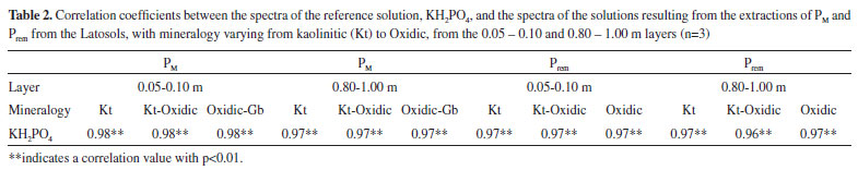 DISCUSSION Samples from the soil profiles The texture of the soil profile samples varied from average to very clayey, with iron concentrations ranging between 50 and 250 g kg-1, thus classifying them as hypo- to meso-ferric. The soils had kaolinitic, kaolinitic-oxidic and oxidic mineralogies (Table 1).29 The mineralogical variation of these latosols can be explained by the influence of the local relief.44,45 The same level of variation in particle size, mineralogy and organic carbon of latosols was also observed by Balbino et al.46 and Reatto et al.45 for regional catenas from the Brazilian Central Plateau. Spectra and concentrations of PM and Prem in the soils Spectra from the PM and Prem phosphate extraction solutions The spectrum of the reference solution (KH2PO4) contained an absorption peak between 900 and 1100 nm (Figure 1Sa). The spectra of the PM and Prem solutions contained a similar absorption peak (Figure 1S b and c). This peak reflects the stretching frequency of the P-OH bond in association with the presence of non-polar, divalent or trivalent orthophosphate molecules in the solution.4,8 Bogrekci and Lee9 observed a maximum absorption of PM in the region close to 900 nm in sandy soils incubated with different concentrations of P in the form of KH2PO4, and Maleki et al.47 identified the wavelengths of 1003, 1009, 1103 and 1128 nm as the main peaks of Olsen-P observed in the Vis-NIR spectrum. Therefore, the PM and Prem solutions had functional P-OH groups from orthophosphate with characterization potential for PM and Prem by diffuse Vis-NIR reflectance spectroscopy. The similarity in the absorption spectra from the PM and Prem solutions, regardless of the depth, mineralogy and method, can be attributed to the light absorption properties of the water molecule, which homogenized the absorption intensity for the different concentrations of P in the solutions.10 The P concentrations of the PM solution were negatively correlated (< -0.80, p<0.01) with the spectra for the wavelengths between 650 and 1150 nm (Figure 1a). This relationship is explained by the P-OH groups' (i.e. orthophosphate) present in the soil extracts and, also, by the extraction of organic carbon from the soil by the double-acid extractant used for PM, as this region of the spectrum corresponds to the region of the third overtone of the C-H, C-H2 and C-H3 molecules.3,16,48 This was observed with a significant correlation between the C and PM concentrations of the soil samples (r2=0.412**). For a given P concentration, the PM concentration determined by colorimetry increases with an increase in the amount of C extracted by the double-acid solution (Figure 2). Organic carbon is solubilized by the Mehlich-1 method by an effect of the pH, the reaction of ions present in the extractant with the adsorbed molecules and, especially, the relationship between the mineral and organic forms of P.49-51 Considering the organic phosphorus, the samples from the soil profiles had Po concentrations between 0.91 and 14.50 mg kg-1 (Table 1), which, according to Chapuis-Lardy et al.,43 may represent up to 75% of the total P present in latosols from the Brazilian Central Plateau and, according to Cross and Schlesinger,52 up to 80% of the labile P of the latosols. This P fraction is primarily composed of the phosphates of sugars, monoesters, diesters, inositols and mononucleotides21 and can be solubilized by the double-acid extractant used for PM, as observed in Figure 2 and Table 3. The solubilization of Po by the double-acid extractant also explains the absence of a correlation between PM and the aluminum oxide content and the weak relationship with the iron concentrations from the sulfuric acid extraction (Table 3). The negative correlation between the PM concentrations and the wavelengths between 650 and 1150 nm can be explained, in part, also by the formation of the molybdenic-P complex. The reaction between the P-monoester with molybdenum (which has an octahedral molecular structure) forms a tetrahedral molybdenum-P structure with lower absorbance energy. Thus, with an increase in the concentration of P determined by the molecular absorption method, the absorbance energy of the sample in the Vis-NIR region decreases. The Prem methodology evaluates the capacity for phosphate exchange between the solid soil phase and a calcium chloride solution initially containing 60 mg L-1 P. Thus, the absence of a correlation between the Prem concentration and the wavelengths between 900 and 1100 nm can be explained by the presence of Ca2+ (CaCl2) because it can precipitate the phosphate from the solution.53 There is also the possibility of the formation of various layers of P around Ca by the action of Van der Waals forces, hindering the observation of a correlation between the Prem concentration and the Prem solution spectra. Spectra of the soil samples For the spectra of the soil samples, the region from 450 - 550 nm, those close to 1400 nm and 1900 nm, and that from 2200 - 2300 nm exhibited potential for the prediction of PM and Prem. In contrast, the region between 780 and 1000 nm had low absorption intensity with a poorly defined peak (Figures 2Sb). These results demonstrate that the physico-chemical relationship of the soil spectra with the PM and Prem concentrations is dependent on other soil attributes, without a specific molecular relationship, as observed for the spectra of the solution. This relationship was also observed by Daasch and Smith,8 Murray and Williams4 and Bogrekci and Lee9 when examining specific functional groups in aqueous media, prepared in the laboratory without interference from other soil attributes. The regions from 450 550, 780 1100 and close to 2200 nm can be spectrally active for the prediction of PM concentrations because of the interaction of P with the organic matter of the soil. In this regard, the regions between 450 and 630 and between 680 and 800 nm are sensitive to the different stages of decomposition 