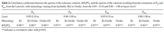 CONCLUSIONS The spectra of the PM and Prem solutions contained an absorption peak in the region between 900 and 1100 nm, similar to the reference spectrum, demonstrating the potential for the characterization of soil PM and Prem by diffuse Vis-NIR reflectance spectroscopy. In the soil spectra, the regions that were active for the prediction of PM and Prem differed from those that were observed in the reference solution (KH2PO4), the PM extraction solution and the Prem determination solution, with absorption peaks between 450 and 550 nm, close to 1400 and 1900 nm, and between 2200 and 2300 nm. The region between 780 and 1000 nm had a low absorption intensity with a poorly defined peak, demonstrating that the physical-chemical relationship of the soil spectra with the PM and Prem concentrations is dependent on other soil attributes. The PM prediction models for quantitative analyses, especially in samples with more than 8 mg P kg-1, is hindered by extraction of organic matter by the double-acid extractant and the correlations of the soil spectra at the wavelengths between 450 and 550 and between 900 and 1100 nm with the OM/Fe2O3 ratio and organic matter content, respectively. Despite the RPD values > 2.5 found in the calibration, the use of the models for the prediction of Prem in the surface layers of the latosols must be viewed with caution because the Prem concentrations were positively correlated with the spectra for the wavelengths between 450 and 550 nm and between 2200 and 2300 nm and these regions are strongly influenced by mineralogy, primarily the presence of iron and aluminum oxides in the form of goethite and gibbsite, respectively, and not correlated with the spectral regions of greatest reflectance in the reference solutions or that used in the colorimetric method.