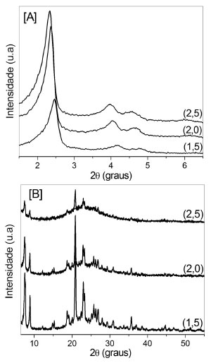 ![]() Figura 1. Difratogramas de raios-X dos materiais híbridos ZSM-12/MCM-41: [A] 2θ = 1,5 a 6,5º; [B] 2θ = 6,5 a 55º. [NaOH] = 1,5; 2,0 e 2,5 mol L-1
