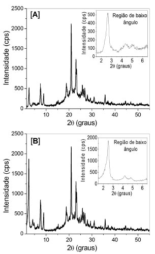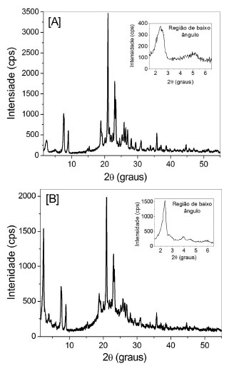 ![]() Figura 3. Difratogramas de raios-X dos materiais híbridos ZSM-12/MCM-41: [A] sintetizado a 100 ºC; [B] sintetizado a 140 ºC