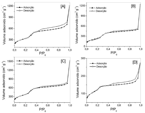 ![]() Figura 5. Isotermas de adsorção-desorção de nitrogênio a 77 K para os materiais híbridos ZSM-12/MCM-41: [A]= [NaOH] = 1,5 mol L-1; [B] = [NaOH] = 2,0 mol L-1 e [C] = [NaOH] = 2,5 mol L-1 e para o material ZSM-12 + MCM-41 [D] obtido via mistura mecânica