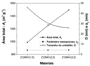 ![]() Figura 6. Correlação entre área total, parâmetro mesoporoso e tamanho do cristalito para os materiais híbridos ZSM-12/MCM-41