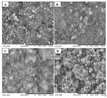 ![]() Figura 7. Micrografias eletrônicas de varredura para os materiais híbridos: [A] ZSM-12/MCM-41 (1,5); [B] ZSM-12/MCM-41 (2,0); [C] ZSM-12/ MCM-41 (2,5); e para [D] ZSM-12 + MCM-41