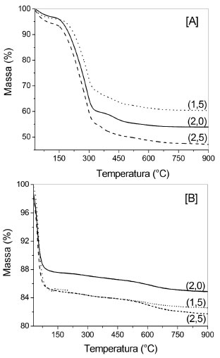 ![]() Figura 8. Curvas termogravimétricas dos materiais híbridos ZSM-12/MCM-41: [A] como sintetizados; [B] calcinados, onde [NaOH] = 1,5; 2,0 e 2,5 mol L-1