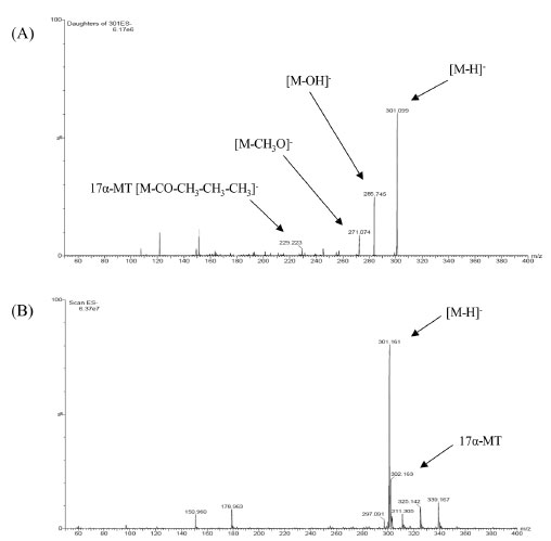 ![]() Figura 2. (A) Espectro ESI(-)/MS/MS do padrão analítico do hormônio 17α-MT. (B) Fingerprint ESI(-)/MS do 17α-MT na amostra de água de rio
