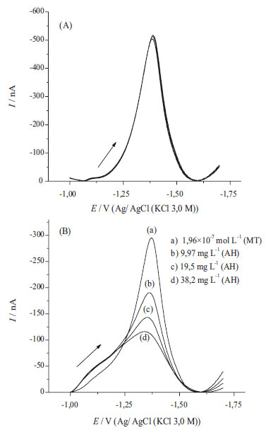 ![]() Figura 3. Voltamogramas de 17α-MT (1,96×10-7 mol L-1), adições sucessivas de AH. (A) Baixas concentrações de AH (4,9×10-3 a 0,015 mg L-1), (B) Altas concentrações de AH (9,97 a 38,2 mg L-1). Em meio de NaOH 5,0×10-3 mol L-1 pHaparente 9,0, com a = 50 mV, f =140 s-1 e ΔEs= 2 mV. Com ajuste da linha base.
