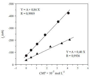 ![]() Figura 4. Relação entre a intensidade de corrente e a concentração de 17α- MT em relação a matriz, em água ultrapura (●) e em água de tanque de piscicultura (▲) nas concentrações de 4,6×10-8 a 4,2×10-7 mol L-1