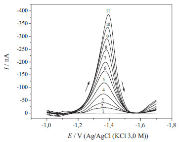 ![]() Figura 5. Voltamogramas de onda quadrada obtidos para a curva analítica de padrão externo do 17α-MT com HMDE. Parâmetros: f (140 Hz), a (50 mV), ΔEs (2 mV), NaOH 5,0×10-3 mol L-1 pHaparente 9,0. Concentração: (1) 0, (2) 1,0×10-8, (3) 3,0×10-8, (4) 6,29×10-8, (5) 1,09×10-7, (6) 1,67×10-7,(7) 2,31×10-7, (8) 4,18×10-7, (9) 5,98×10-7, (10) 1,10×10-6, (11) 1,87×10-6 mol L-1. Com ajuste da linha base. Reproduzida da ref. 19